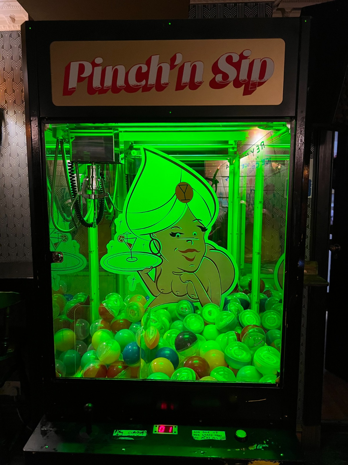 Fortunately for me, the coin did work in the Pinch’n Sip. My guess is they were both minted in the same decade. I maneuvered the claw over one of the plastic balls and hit the down button. After a slow descent, the claw successfully, if precariously, picked up and then deposited my first flavor into the exit shoot. After a second go, I had my two flavors: pineapple and ginger. The talented bartended added some rum and I had a delicious cocktail. Yum!